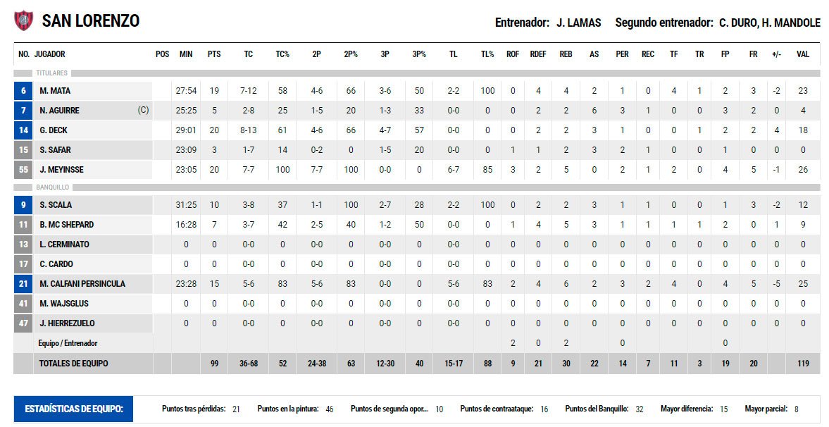 En el elenco azulgrana se destacaron Gabriel Deck y Jerome Meyinsse con 20 tantos cada uno. También sumó 19 Marcos Mata y 15 M athías Calfani, quien además capturó 6 rebotes y realizó 4 tapas.
